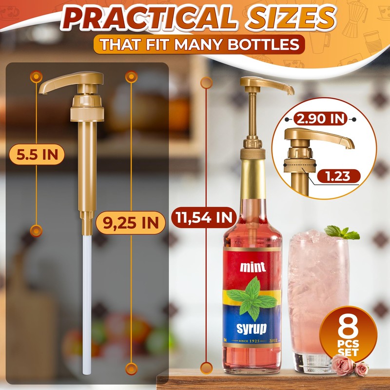- Package Include: In our package you will get 8 pieces of coffee creamer pump dispenser. These coffee syrups pumps for bottles measures about 11.54 inches of the dispenser at the top (open) and 9.25 inches dispenser position down (closed) with shiny gold color.