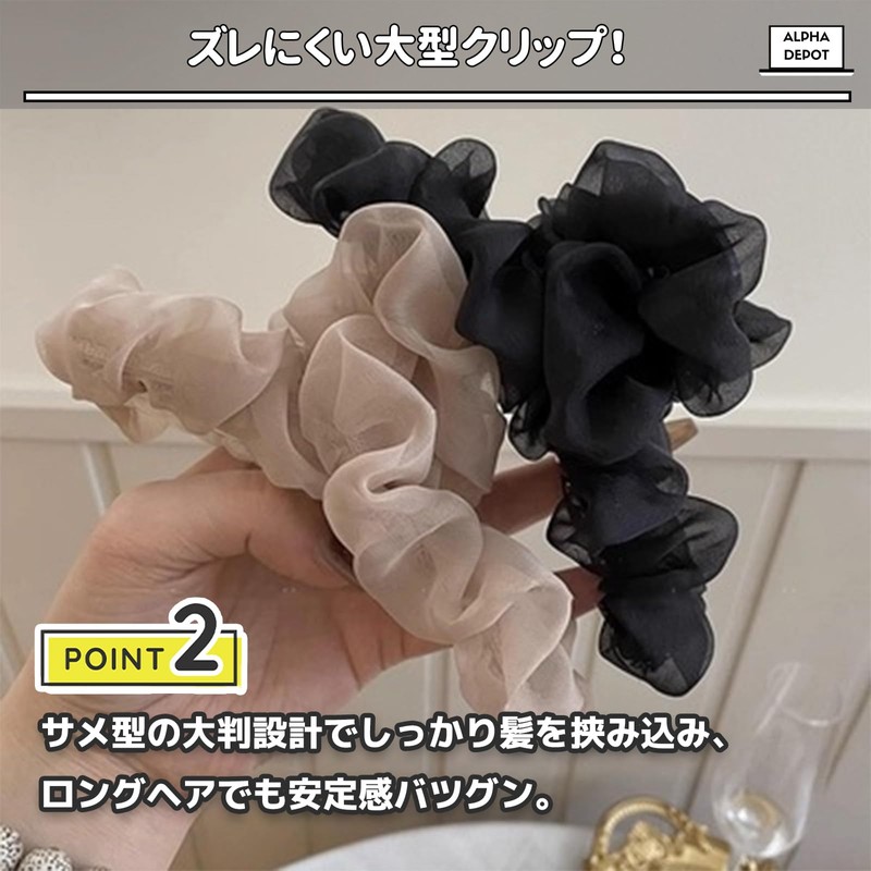 - 【製品仕様】形状:大判サメ型+メッシュ装飾付きグリップタイプ/材質:プラスチック本体+アクリルメッシュ/表面処理:艶消し仕上げ(グリップ部)+ふんわり質感メッシュ/用途:まとめ髪・後頭部アレンジ・お団子スタイル用ヘアアクセサリー/サイズ:約12cm(長さ)×6.5cm(幅)/ブラック&ベージュの2点セット