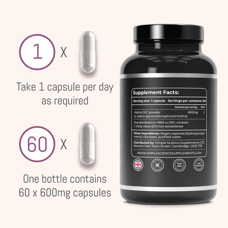 - OPTIMISED FORMULATION - simplescience is at the cutting edge of supplementation, and we design our products very carefully. 600mg per day is at the high end of the optimal recommended dosage range for Alpha GPC, delivering optimally powerful results.