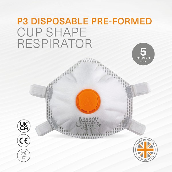 Alpha Solway 3530V Lightweight UK Made Pack of 5 Latex Free FFP3 Valved Disposable Respirators EN 149:2001+A1:2009 FFP3 Masks UK Certified Cup Shaped Dust Mask Respirator Single Use