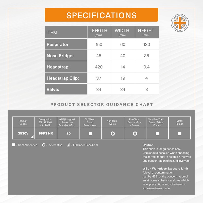 - Compilance of 149:2001+A1:2009 FFP3 NR Protects from Non-Toxic Dusts and Oil and Water Based Particulates making it suitable for outdoor and indoor usage