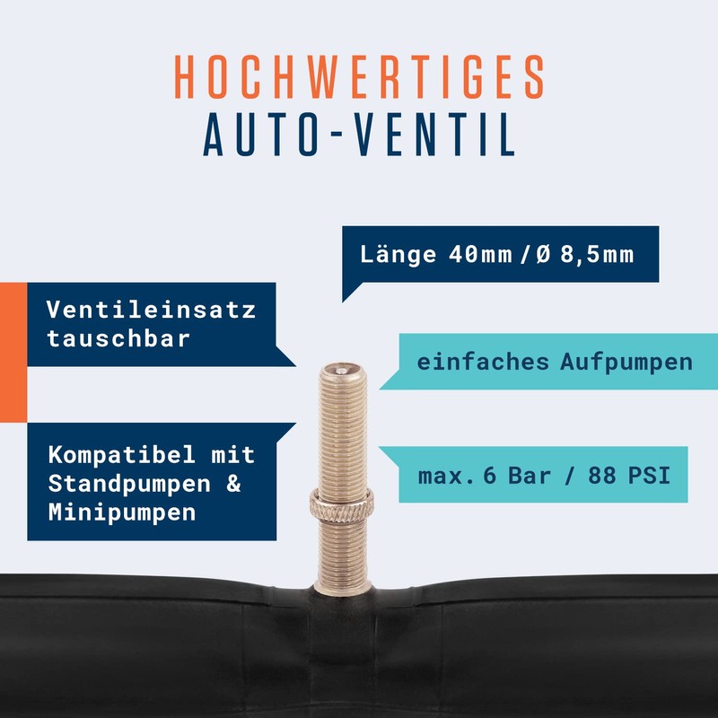 - Car valve – The high-quality Schrader valve (Schrader valve) of our bicycle tube ensures high airtightness and easy inflation. It can be inflated with all standard floor pumps, mini pumps, hand pumps or CO2 cartridge pumps.