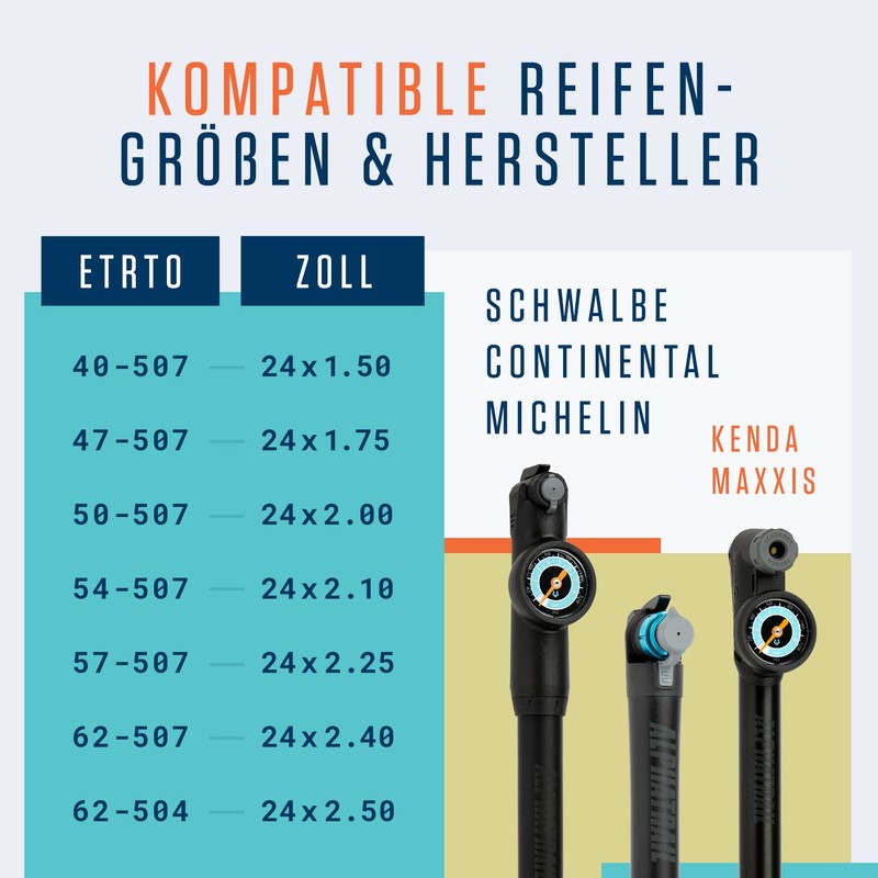 - Compatible tyre sizes: our bicycle inner tube is compatible with the following bicycle tyres: 40-507 (24 x 1.50), 47-507 (24 x 1.75), 47-507 (24 x 1.85), 47-507 (24 x 1.90), 50-. 507 (24 x 1.90), 50-507 (24 x 2.00), 50-507 (24 x 2.125), 54-507 (24 x 2.10), 57-507 (24 x 2.125), 57-507 (24 x 2.2.2 5), 62-507 (24 x 2.40), 62-504 (24 x 2.50). The respective tyre size is easy to read from the bicycle tyre (sidewall).