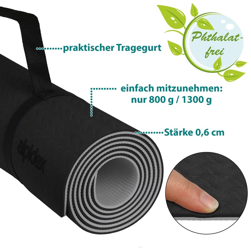 ALPIDEX Yoga Mat Non-Slip 190 x 61 x 0.6 cm | 190 x 90 x 0.6 cm Phthalate-Free Fitness TPE Mat Gymnastics Pilates Sports Yoga Training Mat Sleeping Mat, Black/Grey, 190 x 61 x 0.6 cm