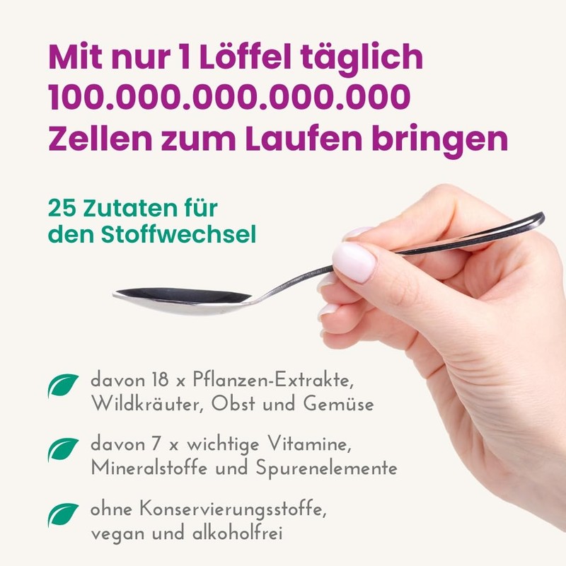 • EINFACHE ANWENDUNG  PERFEKT FR DEN T?GLICHEN GEBRAUCH: Dank der leicht dosierbaren 520 ml Flasche ist das Elixier ideal fr die t?gliche Einnahme. Ein Essl?ffel reicht bereits, um den K?rper optimal zu untersttzen und den Stoffwechsel in Schwung zu halten  einfach in den Alltag integrieren und die Vorteile genie?en!