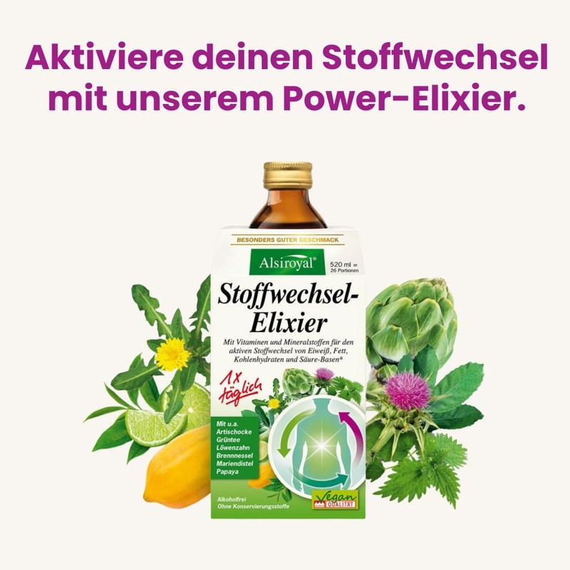 • SCHMECKT FRUCHTIG & FRISCH: Neben der umfassenden N?hrstoffversorgung berzeugt das Alsiroyal Stoffwechsel Elixier mit einem natrlichen, fruchtigen Geschmack. Es ist alkoholfrei und kommt ohne knstliche Konservierungsstoffe aus  ideal fr alle, die Wert auf eine gesunde und natrliche Erg?nzung legen.