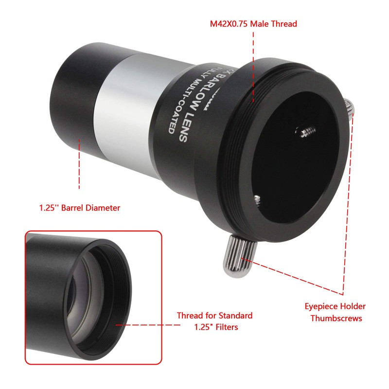 Alstar 1.25" 2X Barlow Lens MultiCoated Metal with M42x0.75 Thread Camera Interface for Telescopes