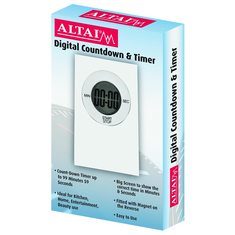 This digital timer has a large easy to read screen and a loud clear beep making it ideal for home and kitchen use. The countdown timer has a max. 99 minutes & 59 seconds, on the reverse of the timer is a magnet which allows you to place the timer conveniently on any magnetic surface. Powered 1 x LR44 battery (Not Included)