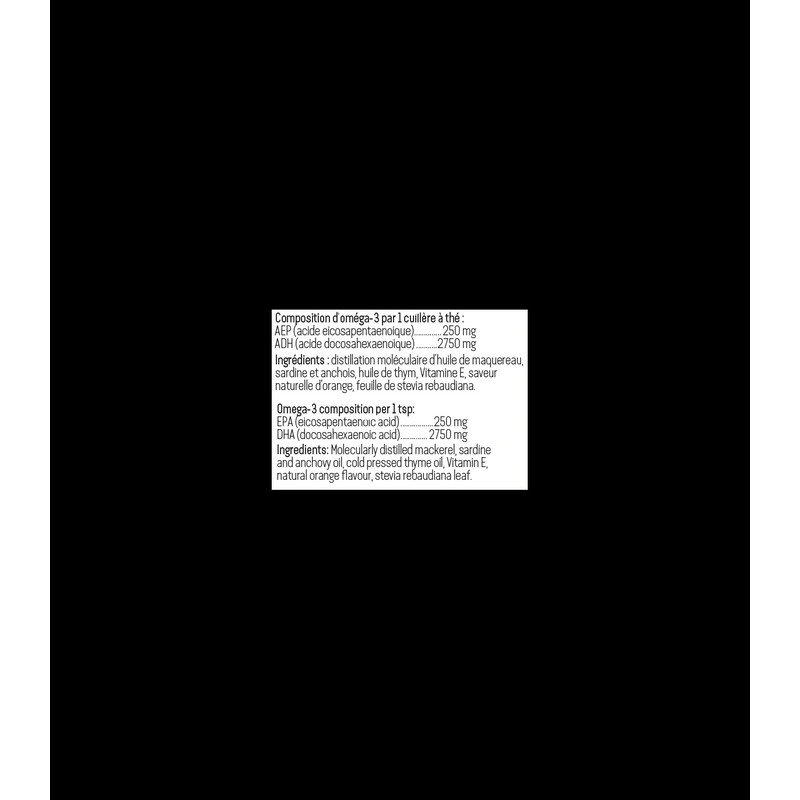 Molecular distillation, fish oil derived from mackerel, sardine and anchovy, Thyme oil, Natural Orange flavor, Stevia.