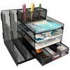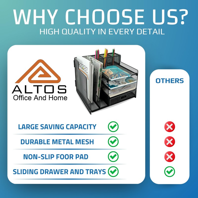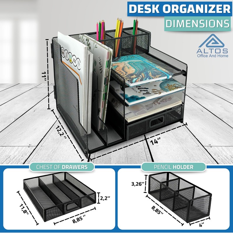 ALTOS OFFICE AND HOME Metal Mesh Desk Organizer, 1 Sliding Drawer, 4 Horizontal Trays and 2 Vertical Sections, with 3 Spaces for Pencils and Accessories Black, Reinforced Edges, Electrostatic Paint