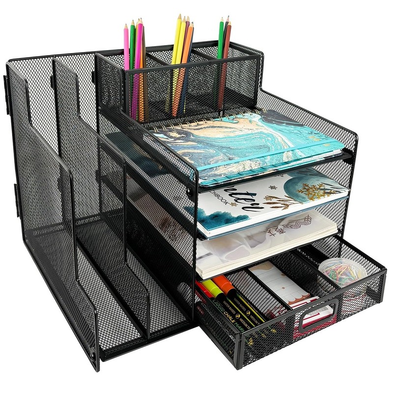 - đăIdeal Desk OrganizerăNewly releases the desk file organizer! The humanized office organization owns 4 sliding trays + 2 Magazine Holders + 3 Hanging Pencil Holders + 1 sliding drawer which tidies up your desktop and is convenient to your office! All the designs specialized to comply with your office, such a perfect supplies desk organizer must be the best choice for your office accessories!