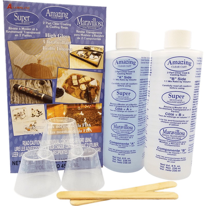 Alumilite's Amazing Clear Cast is a clear casting and coating system that cures to a rigid, durable, clear plastic. Use Amazing Clear Cast for coating or finishing applications such as bar tops, floors, taxidermy scenery, lenses, and all sorts of other clear casting or coating applications. Amazing Clear Cast is an easy to use, 1:1 mix ratio system that cures overnight which allows time for air bubbles to evacuate prior to curing. Amazing Clear Cast can be colored with Alumilite dyes, alcoholic inks, or other non-water base colorants.