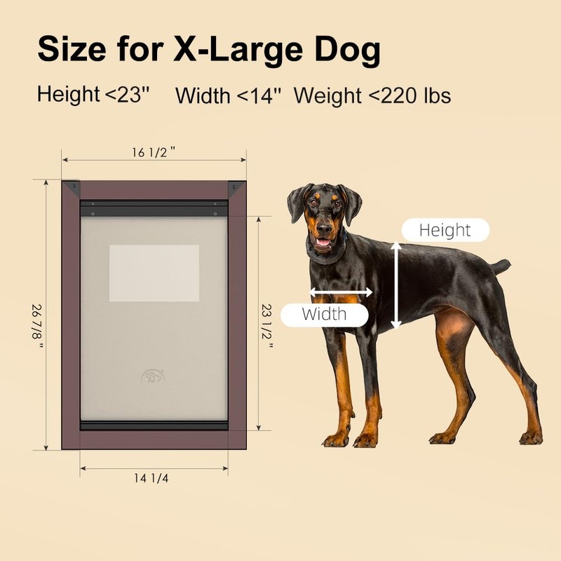 - 【Flexible Size】The dog door with expanding tunnel fits paneled, wood, PVC, and metal doors of 1 3/8'' - 2 1/8'' thick, Suitable for dogs up to 220/100/40 pounds.