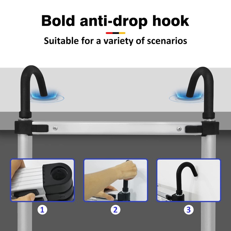 - Telescopic Design: Our telescopic ladder features intelligent locking mechanisms on each rung, allowing you to effortlessly adjust and lock the ladder's height for easy extension and retraction. Please be cautious not to place your thumb between the rungs when folding the extending ladder.