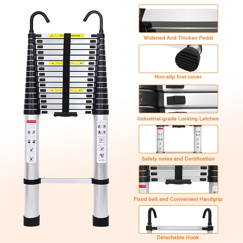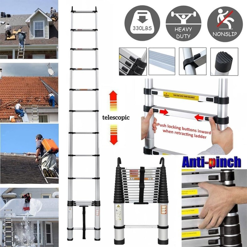 • ☑【Wide Range Of Uses】This multi-purpose telescoping ladder approved by EN131 standards and is CE registered. as a roof ladder, rv ladder, loft ladder, folding ladder, escape ladder, attic ladder, step ladder, suitable for any daily work around your home or backyard, it's ideal tool for repairing roofs, changing light bulbs, cleaning windows, painting, exterior/interior decorating, etc. A safety and lightweight ladder can bring a lot of convenience to your life.
