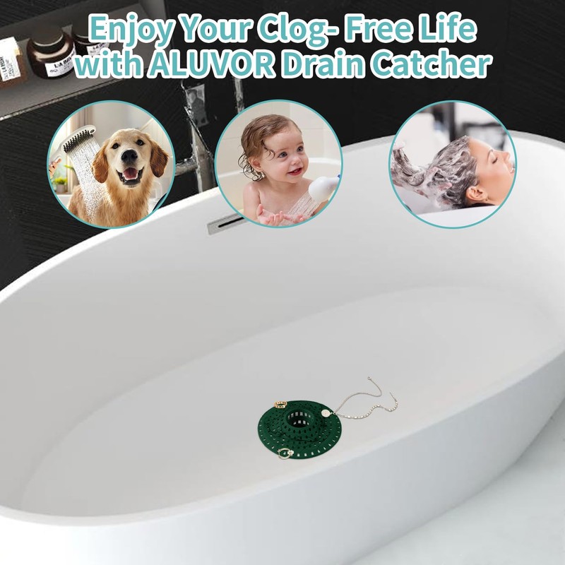- Aluvor's newly all-in-one silicone drain hair catcher: Designed with numerous tiny holes, this bathtub drain hair catcher effectively traps hair while keeping your drain free from clogs. It works effortlessly to stop toys or other items from slipping down the drain.