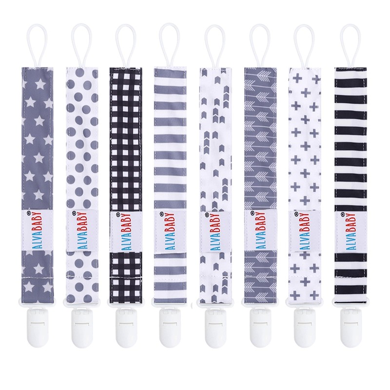 - Material-ALVABABY baby pacifier leash are made of polyester fabric,plastic clip,nylon rope.Paci clip strap is a universal pacifier leash designed with a loop to be compatible with all types of pacifiers,suitable for babies of all ages that newborn,infants,toddler.Pacifier holder clip helps a crawling baby keep their pacifier from dragging on the dirty ground.