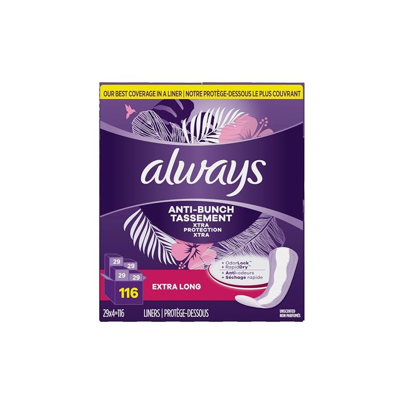 Always Always Anti-Bunch Xtra Protection Daily Liners, Extra Long Length, Unscented, Feel Clean and Comfortable, 116 Count