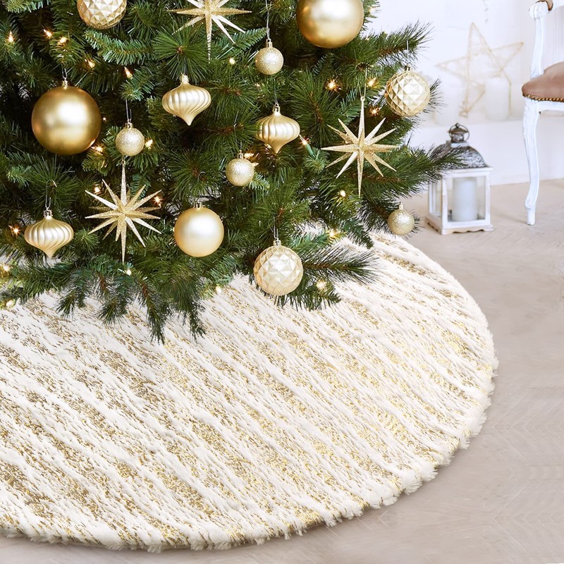 Alynsehom Christmas Tree Skirt, Large White&Gold Bronzing Luxury Faux Fur Tree Skirt Soft Thick Plush Xmas Tree Skirt for Family Holiday Christmas Party Tree Decorations(Gold,36inch/90cm)