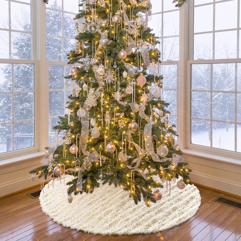 - 【Unique Bronzing&Soft Thick Plush Fabric】: Adopted the most popular and novel gilding process, our Christmas Tree Skirt looks more elegant and stylish than the common white tree skirts. Made of white fluffy faux fur, it is softer than normal ones. High-quality artificial fur will reflect the light, creating an immersive snowy night atmosphere. Traditional and luxury Tree skirt for Christmas holiday decor.
