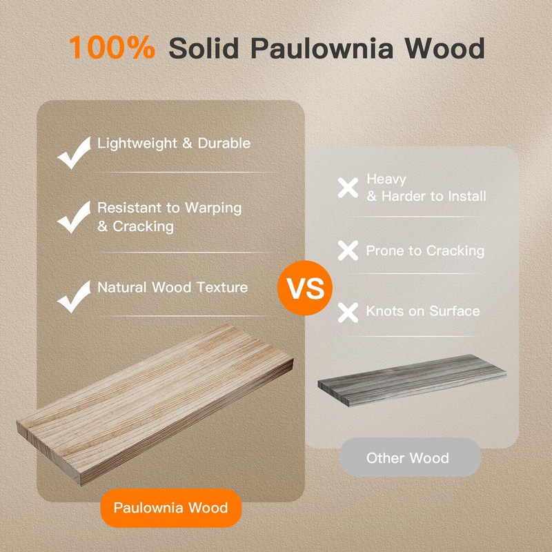 - Solid Paulownia Wood: Our floating shelves are crafted from 100% paulownia wood with a fine wood grain and attractive finish. Paulownia wood is naturally resistant to decay, warping, and pests, making these bathroom shelves perfect for wall decor in any living space.