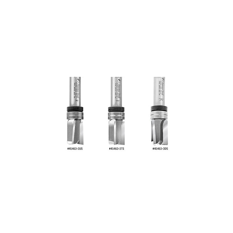 Trimming Router Bits are made by Amana Tool, the leading manufacturers of high quality wood cutting tools. Amana Tool 45463-3TS Carbide Tipped Flush Trim Plunge Template 3/4 D x 1 CH x 1/2 Inch SHK w/ Upper Ball Bearing 3 Flute Router Bit is useful for template/pattern routing of parts, joints, and internal cuts, and can be used in hand-held and table-mounted routers. SPECIFICATIONS: Diameter (D): 3/4; Cutting Height (B): 1; Shank (d): 1/2; Overall Length (L): 3; Replacement Collar: 47739; Replacement Bearing: 47721; Flutes: 3.