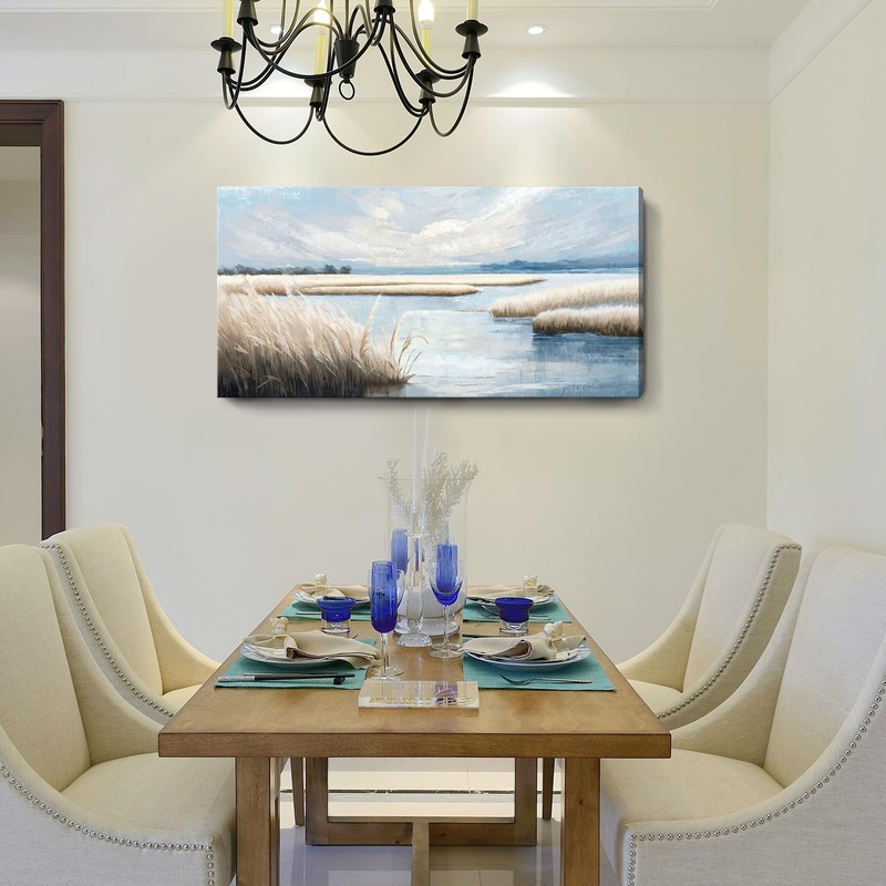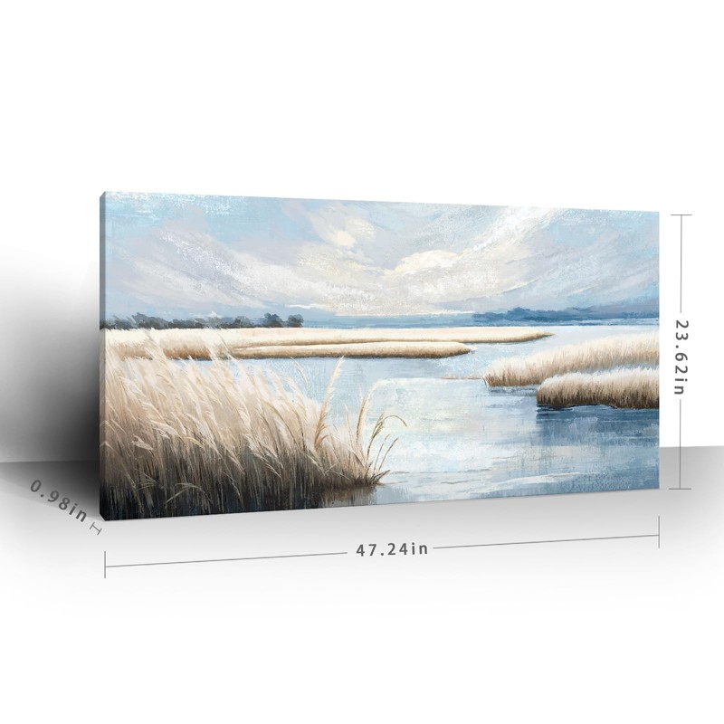 - ➤ Calming Coastal Marsh Escape — Step into serene beauty with this panoramic marshland landscape wall art, featuring gentle reeds swaying beside a glassy waterway. The harmonious blend of soft blue, beige, and ivory tones creates a soothing visual escape, perfect for adding tranquility and timeless elegance to your bedroom, living room, or office.