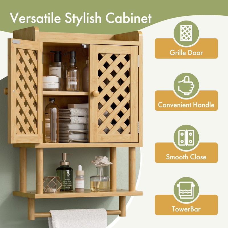 AmazerBath Bathroom Wall Cabinets, Bamboo Medicine Cabinet with Grille Door, Over The Toilet Storage Cabinet with Towel Bar, Wall Mounted Cabinet with Adjustable Shelves for Small Spaces