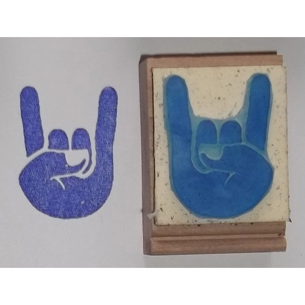 | This is a wonderful wood mounted polymer rubber stamp with an excellent image of a hand making the horns symbol. Size is about 1.5" wide by 1.5" tall. This is a great stamp to share with the kids or to add to your own collection. Don't miss your opportunity to own this amazing stamp! |