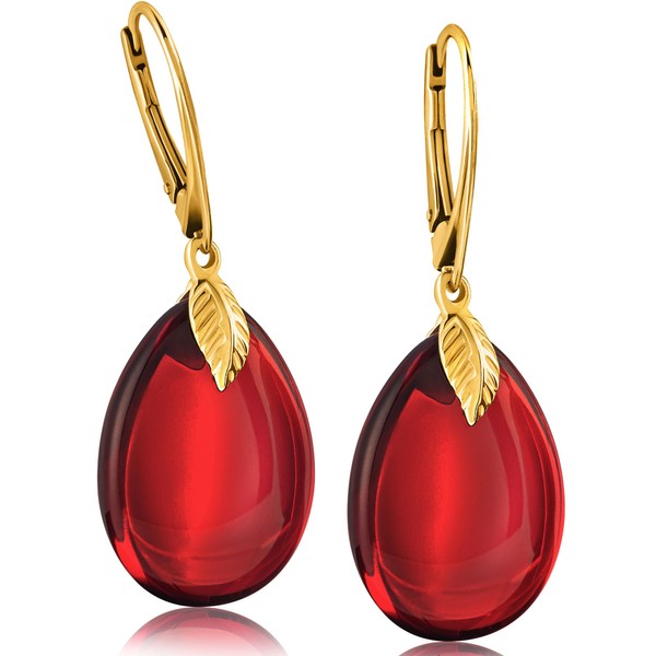Amber by Mazukna - Cherry Red Amber Earrings for Women - Yellow Gold Plated Silver Leverback Closure - 1.69x0.59inch 0.19oz- Dainty Natural Gemstone Drop Jewelry