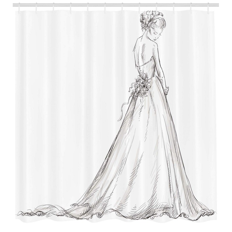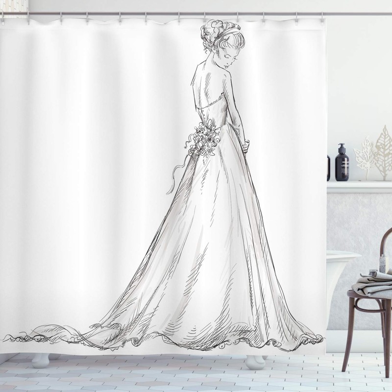 Ambesonne Bridal Shower Curtain, Fairytale Ending of a Love Story Princess Sketchy Bride with Flowers Image, Cloth Fabric Bathroom Decor Set with Hooks, 70" Long, White Black