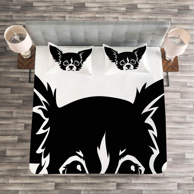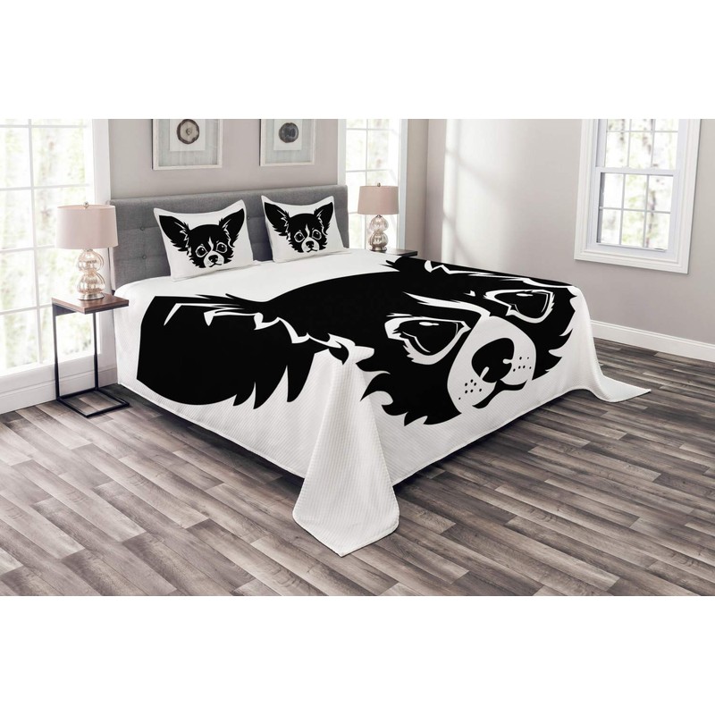 Ambesonne Chihuahua Bedspread, Monochrome Illustration of Like Puppy Head in Cartoon Simplicity, Decorative Quilted 3 Piece Coverlet Set with 2 Pillow Shams, Queen Size, Black and White