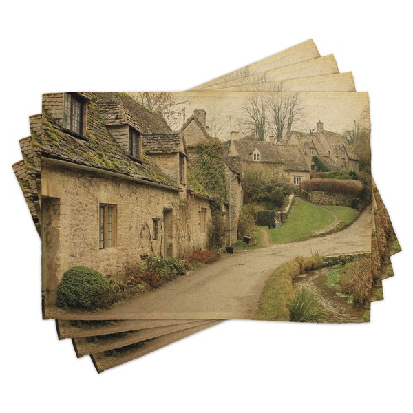 Ambesonne European Place Mats Set of 4, British Town with Stone Houses Retro England Countryside Buildings Image Print, Washable Fabric Placemats for Dining Table, Standard Size, Grey Green