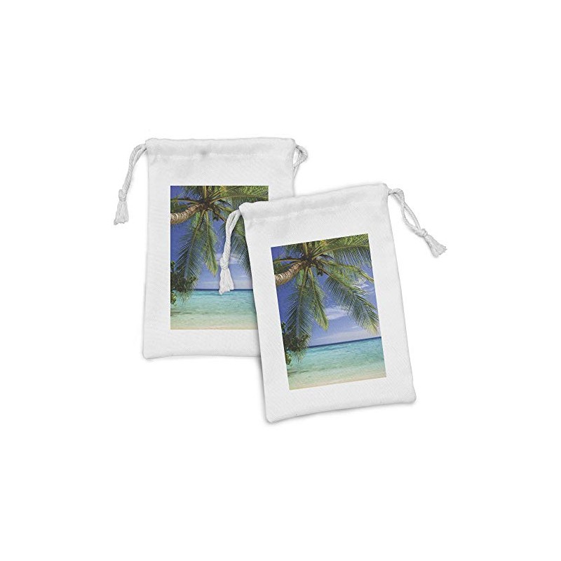 Ambesonne Ocean Fabric Pouch Set of 2, Tropical Paradise View at Maldives Palms Clear Sky Seashore Picture Print, Small Drawstring Bag for Toiletries Masks and Favors, 9" x 6", Green Aqua Blue