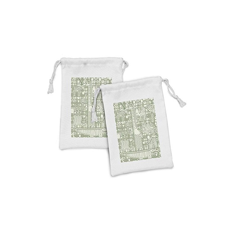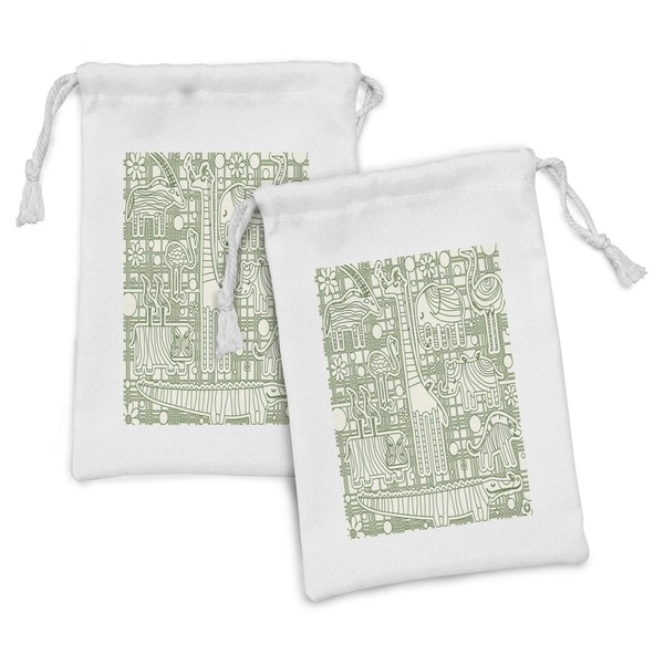 Ambesonne Ostrich Fabric Pouch Set of 2, Hippo Cheetah Pelican Giraffe in Fractal Outline Print, Small Drawstring Bag for Toiletries Masks and Favors, 9" x 6", Fern Green and Cream