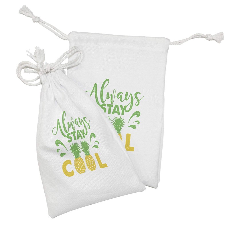 Ambesonne Stay Cool Fabric Pouch Set of 2, Always Stay Cool Calligraphy Summer Vibe Pineapple Fruit, Small Drawstring Bag for Toiletries Masks and Favors, 9" x 6", Lime Green Earth Yellow