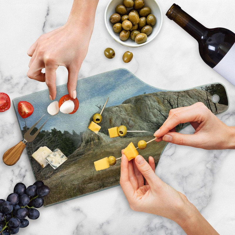 Ambesonne Yellowstone Cutting Board, Big Rock in Orange Spring Mound Yellowstone Forest Cloudy Sky Scenery Nature, Decorative Tempered Glass Cutting and Serving Board, Wine Bottle Shape, Beige Blue