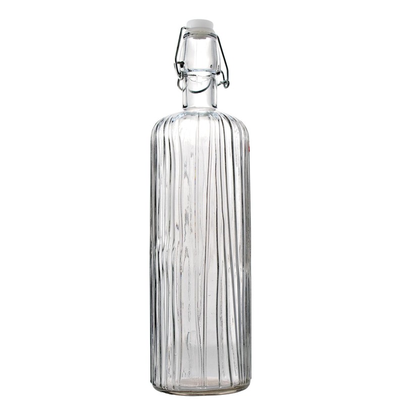 Ambient21 Botella de Vidrio Grueso, Tapa de Goma con Cierre Hermético Reutilizable, Envase de Vidrio Transparente con Relieve, Ideal Bebidas Frías Agua, Jugo, Capacidad 1 Litro (Línea Verical)