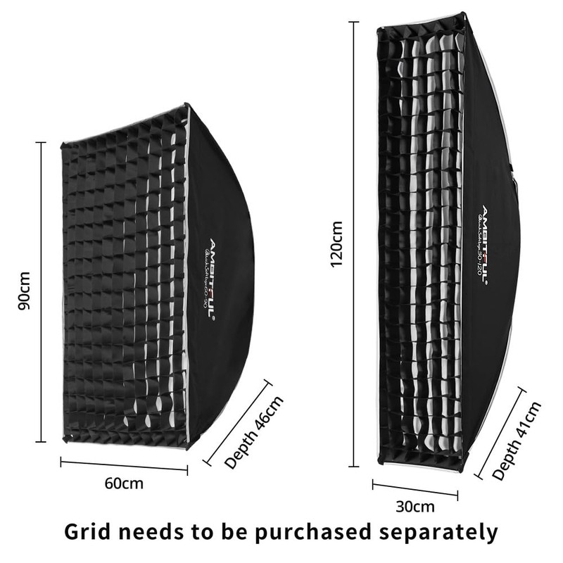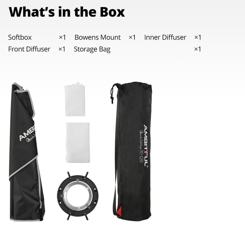• Includes: AMBITFUL 24x35 inch Rapid Softbox Bowens Holder, External Diffuser, Internal Diffuser, Bowens Holder Quick Loop Adapter, Reversible Deflector Tray, Storage Bag (Grid not included)