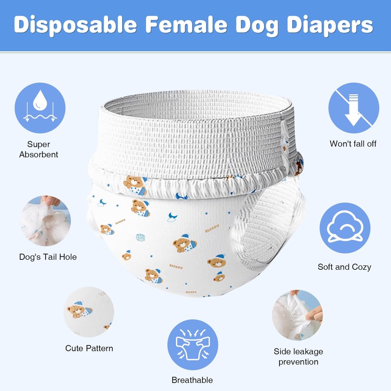 - 🐕FASHIONABLE AND CUTE DOG DIAPERS- Dog diapers with cute bear pattern make your dog more attractive. Compared with washable dog diapers, when the dog diaper is soiled, just throw it away and replace it with a new dog diaper, no need to wait and dry. Compared with normal dog diapers, no need to endure the failure of Velcro, one piece is used as three pieces.