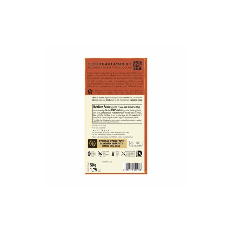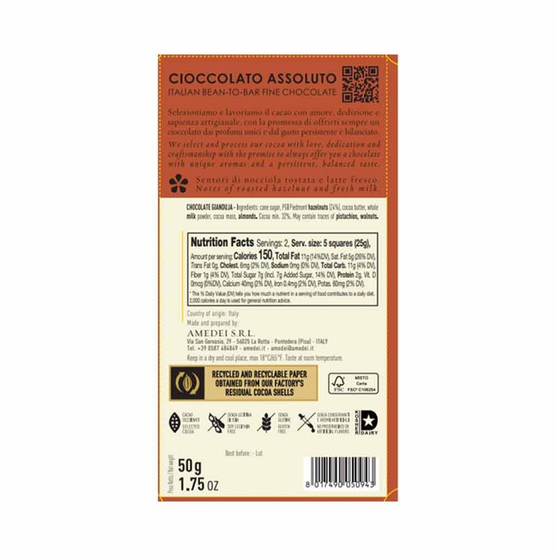 Ingredients: cane sugar, hazelnuts Tonda Gentile Trilobata, cocoa butter, whole milk powder, cocoa mass, almonds, vanilla. Cocoa min. 32%. May contain traces of pistachio, walnut..