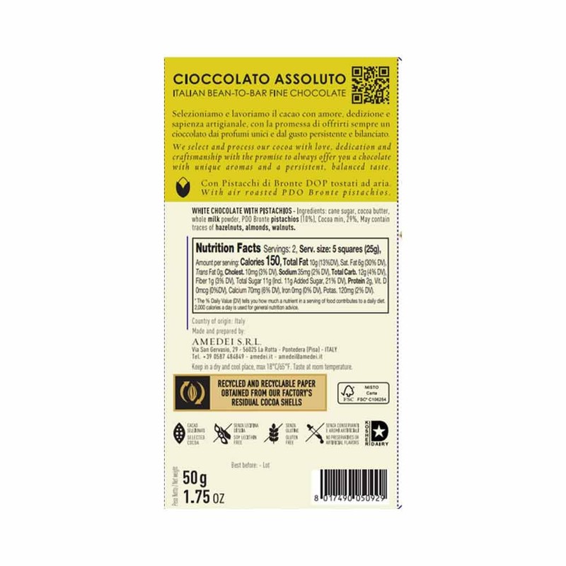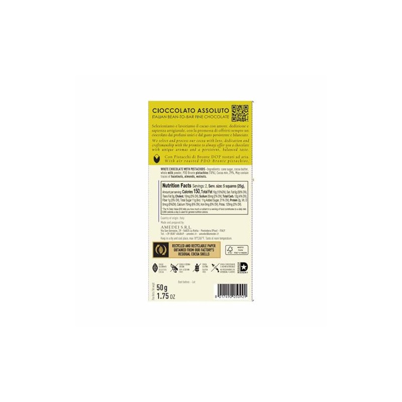 Ingredients: cane sugar, cocoa butter, whole milk powder, pistachios (10%), vanilla. Cocoa min. 29%. May contain traces of hazelnut, almond, walnut. Storage: keep in a dry and cool place, max 18°C (64°F). Taste at room temperature. Net weight: 50g / 1.75oz