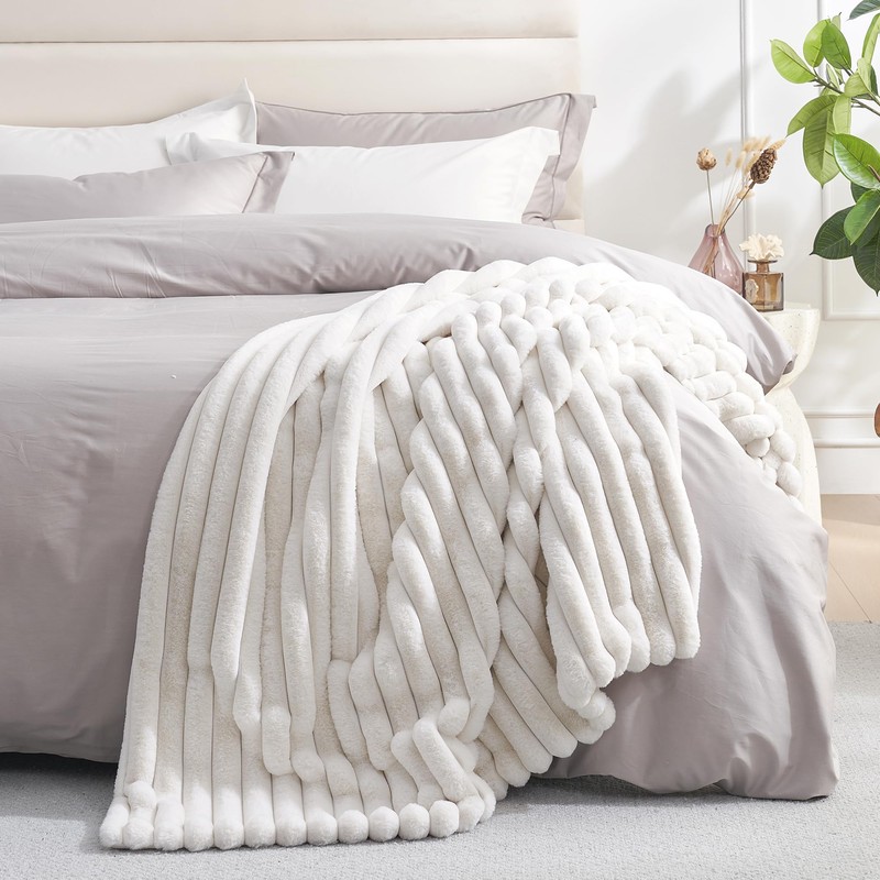 Amélie Home Soft Faux Fur Throw Blanket for Couch, Warm Luxurious Faux Rabbit Fur Striped Throw Blanket, Cozy Fluffy Plush Fur Blanket for Sofa Chair Bed Living Room, Cream White, 50"x 70"