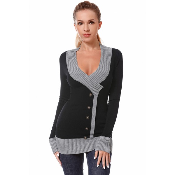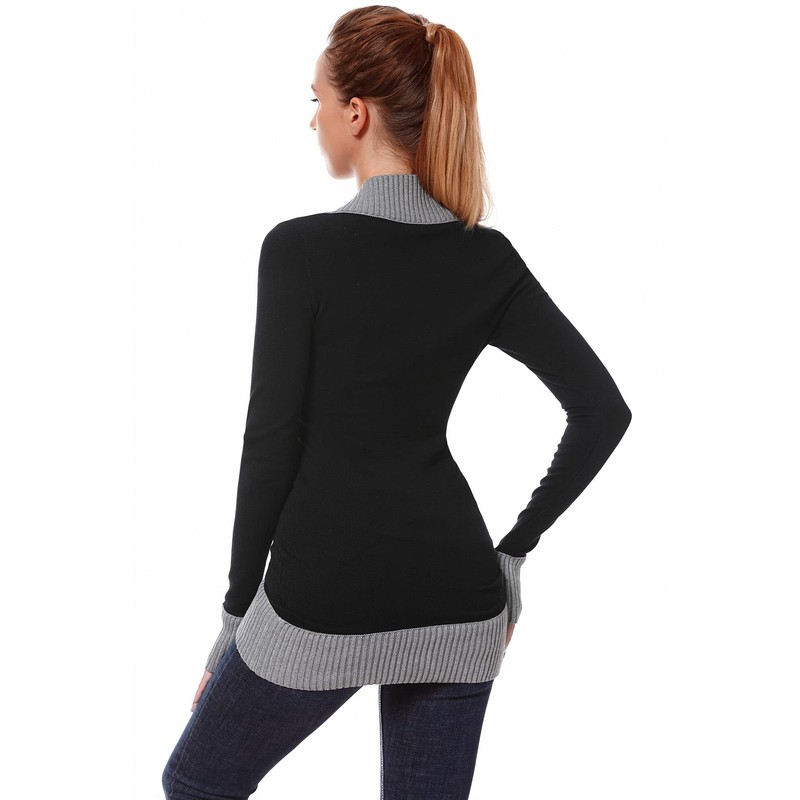 AmélieBoutik Women V Neck Faux Wrap Color Trim Sweater Tunic Top(Black Large)