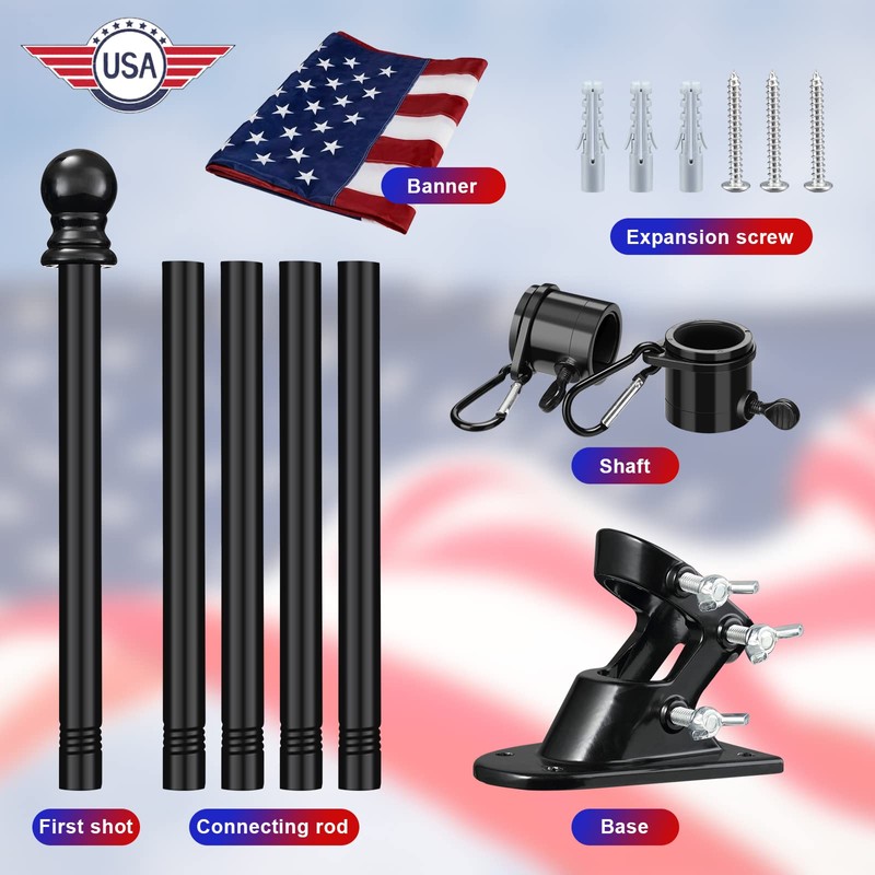 - Flag Pole Kit With American Flag-The package is complete with premium 3x5 ft American Flag,stainless steel flag pole,aluminum alloy bracket, two tangle-free ring clips,and mounting hardware,Great Decoration for your house roof,porch,garage.