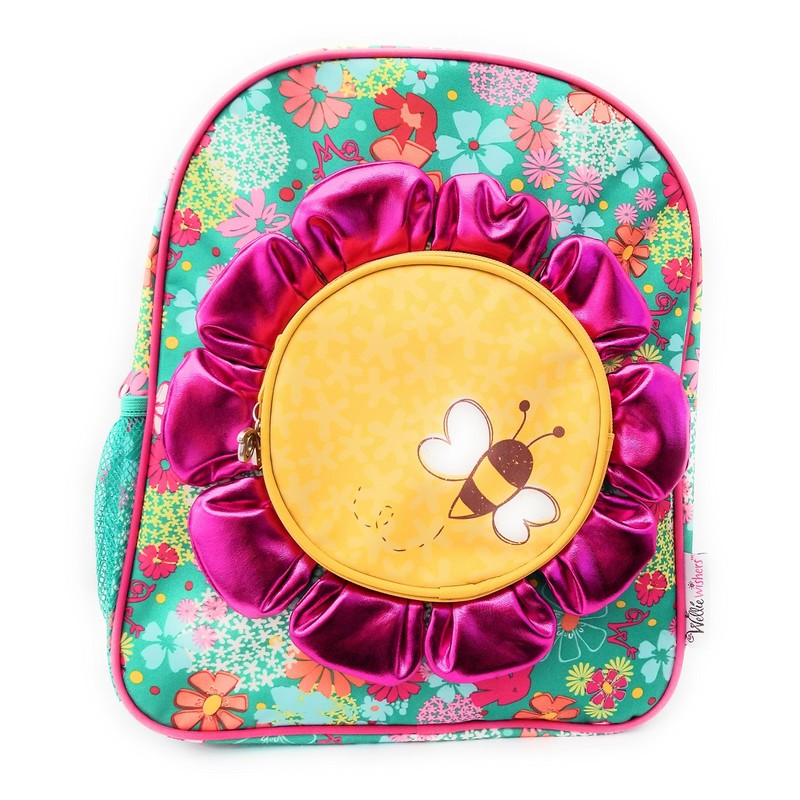 - American Girl backpack features a pattern of colourful flowers with a yellow sunflower and bee bag.