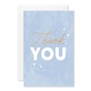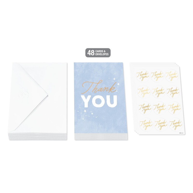 • Elegantly designed thank you cards features gold foil lettering and stars on a soft blue background perfect for sending a special note after baby showers, weddings, graduations, and more