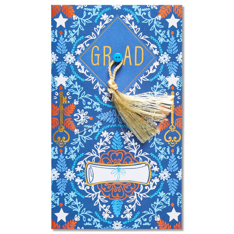 - This graduation card features tassel and button attachments and shiny gold foil embellishments