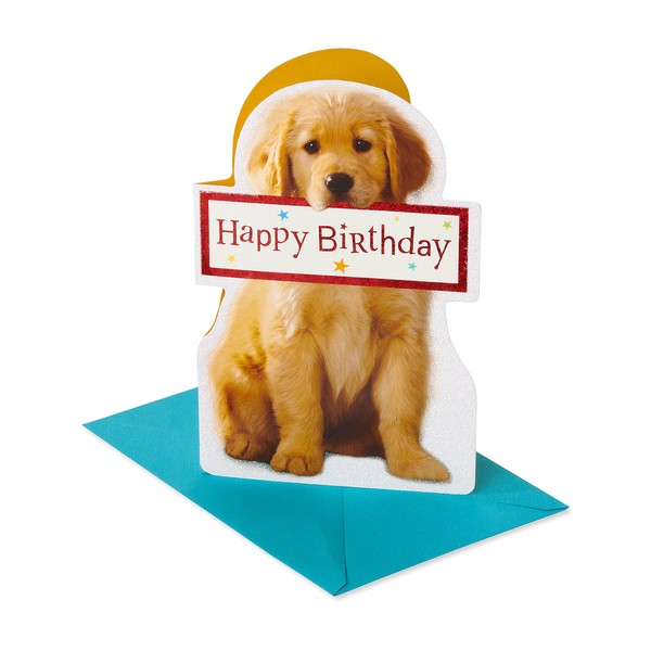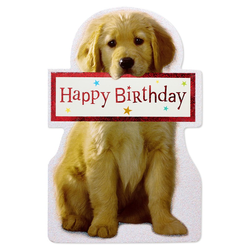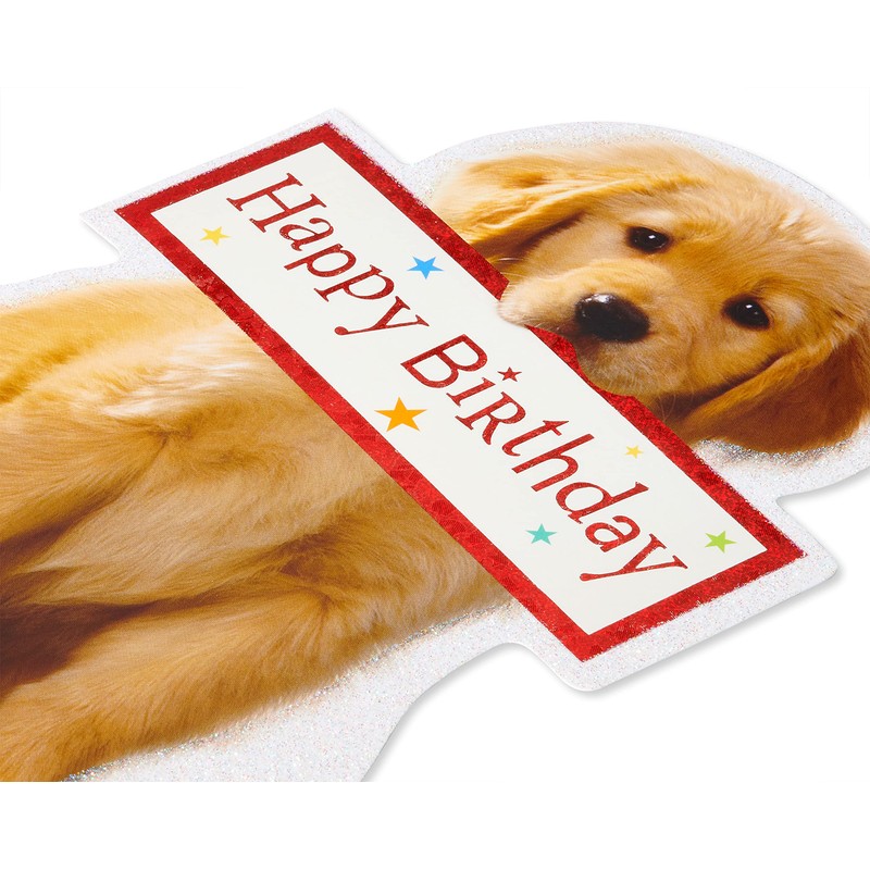 • This birthday greeting card features glitter.