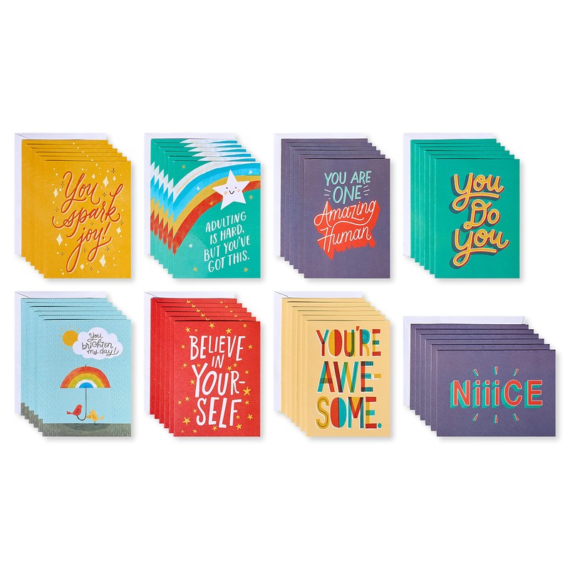 - Cards feature inspirational, thank you, and thinking of you imagery with bright and trendy hand lettering